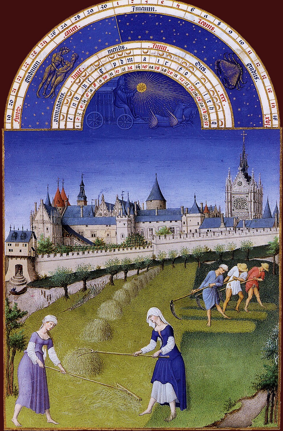 Image : Très riches heures du duc de Berry, Juin, frères Limbourg, entre 1413 et 1416, musée Condé, Chantilly. Les frères Limbourg ont utilisé une laque rouge, obtenue à partir de bois de brésil, pour enluminer le manuscrit.