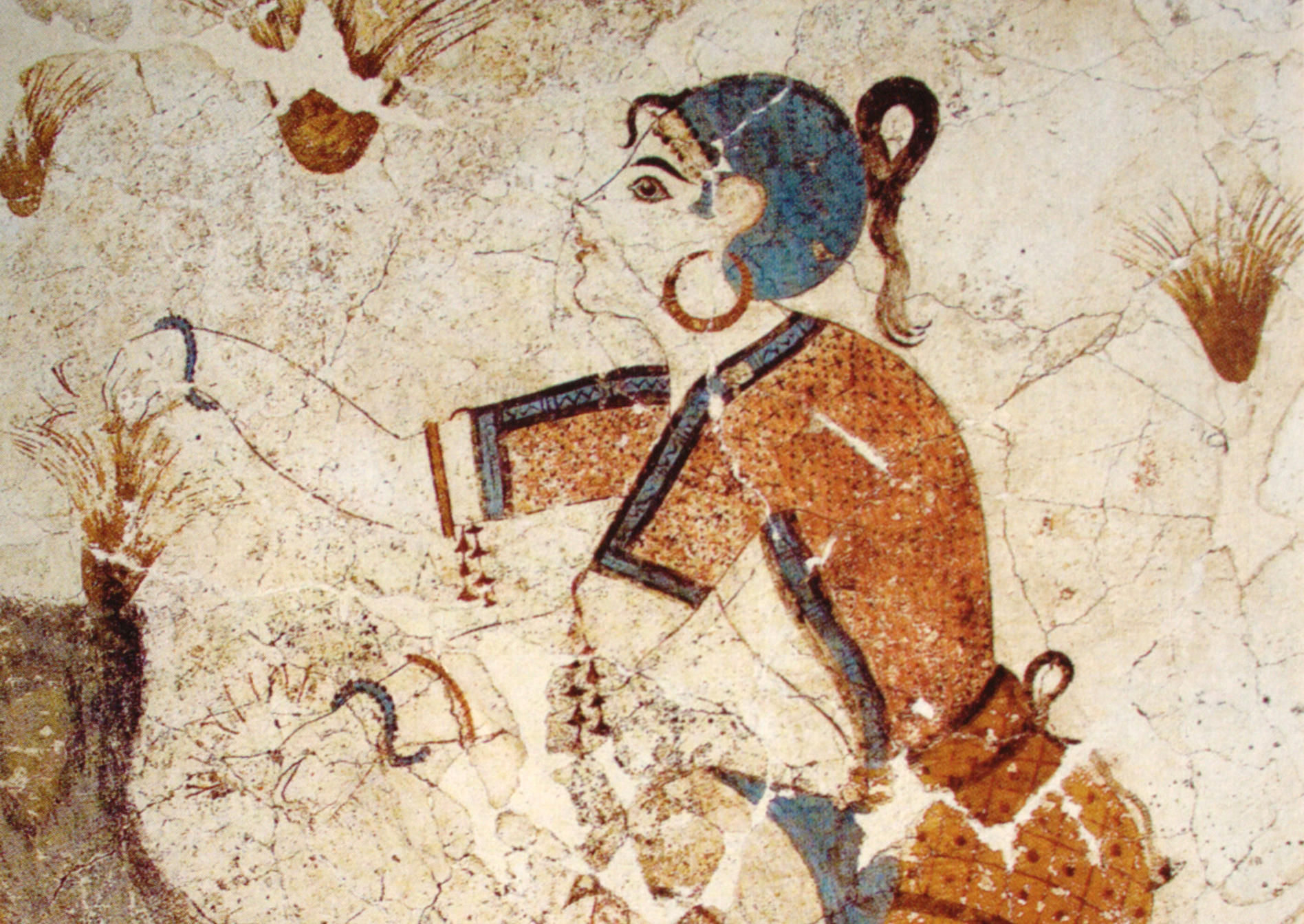 Image : Cueilleuse de safran, XVIIe siècle av. J.-C., fresque, Xeste 3, Akrotiri, Santorin, Grèce. Appartenant à un vaste programme iconographique, cette jeune femme s’incline devant une déesse à laquelle elle tend des crocus à safran. Protégée par un griffon, la divinité se voit également offrir des crocus par un singe bleu. Plus loin, deux autres femmes cueillent des crocus sativus.